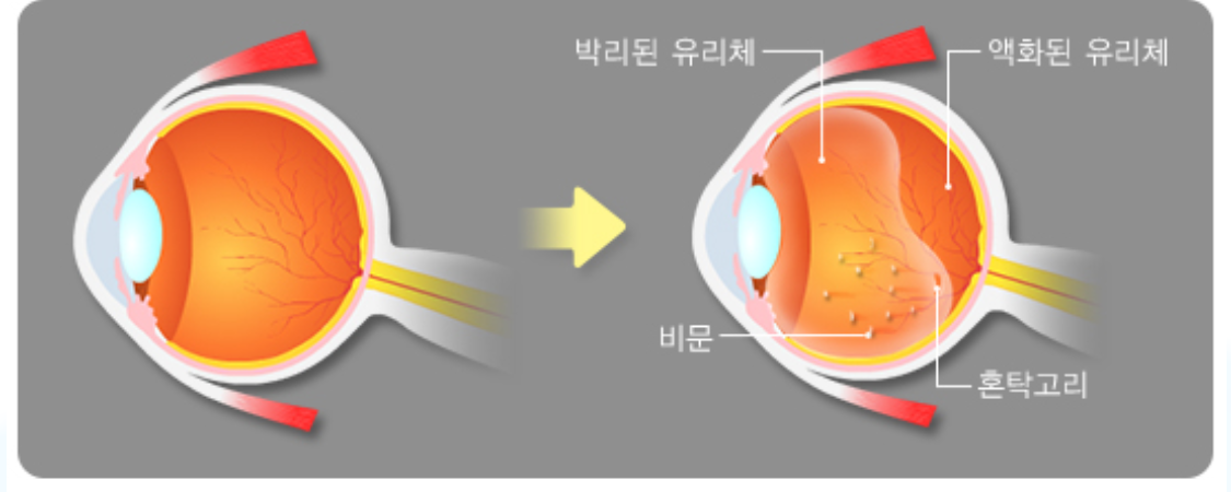 - 유리체 출혈: 유리체 내에 출혈이 발생하여 부유물이 생기고 시야가 흐려지는 질환입니다. 당뇨병, 고혈압 등의 만성 질환이나 안구 외상이 원인이 될 수 있습니다.